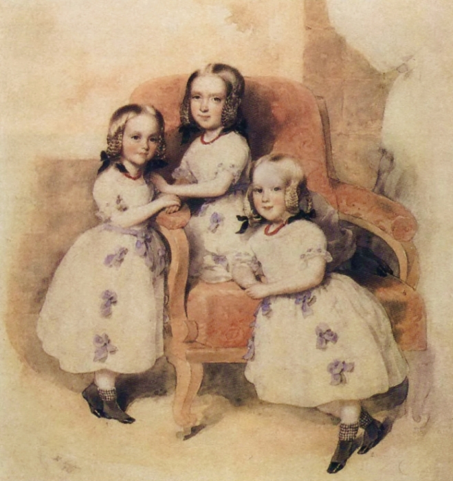 Дочери Дантеса: Слева направо: Леони, Матильда, Берта. Акварель Леопольда Фишера. 1843: