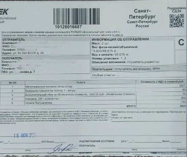 Перечислил деньги за товар и работу, оплата СДЕК Беларусь - СПб при получении.