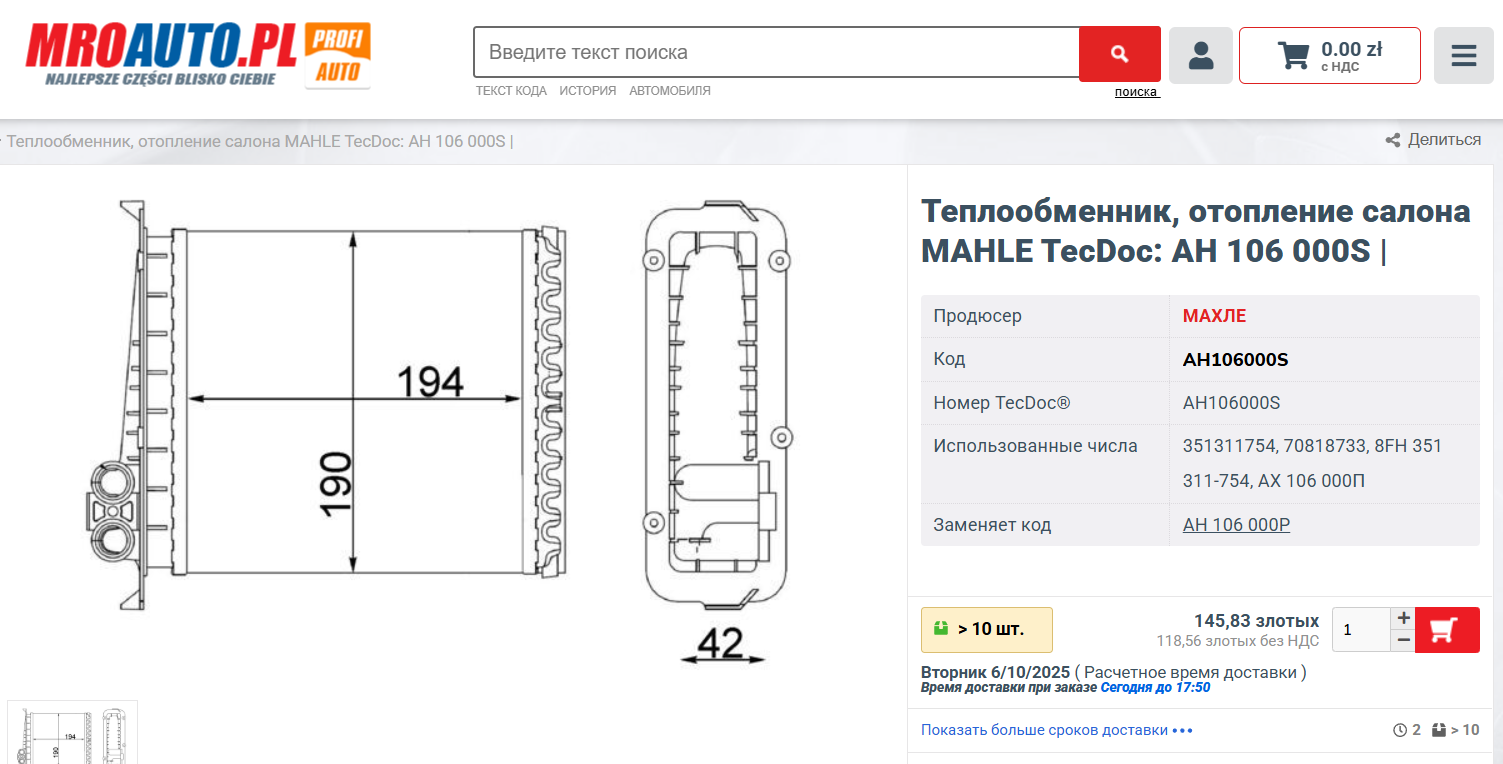 Радиатор печки Mahle-BEHR (BEHR поставлял на конвеер)