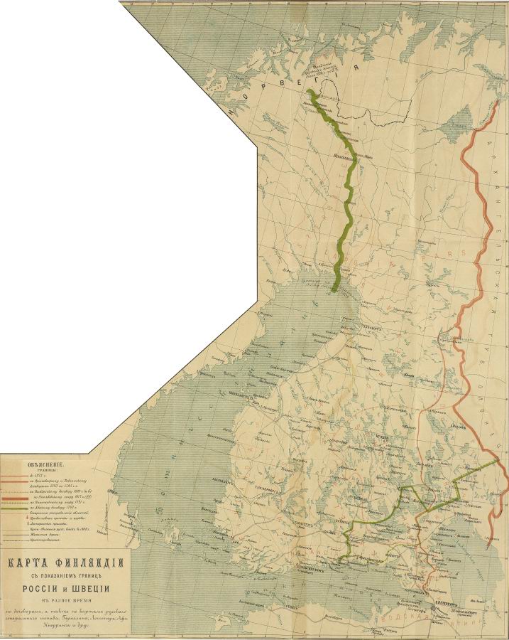 Карта Финляндии с указанием границ России и Швеции в разное время по договорам, а также по картам генерального штаба, Гермелина, Лоттера, Аф-Кнорринга и друг. Ордин, Кесарь Филиппович «Покорение Финляндии. Опыт описания по неизданным источникам». Том I. — СПб: Тип. И. Н. Скороходова, 1889