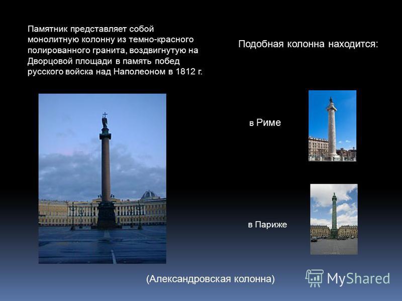 11 сентября 1832 году на Дворцовой площади Петербурга установлена, а ровно через 2 года в 1834 году торжественно открыта Александровская колонна в честь победы над Наполеоном.